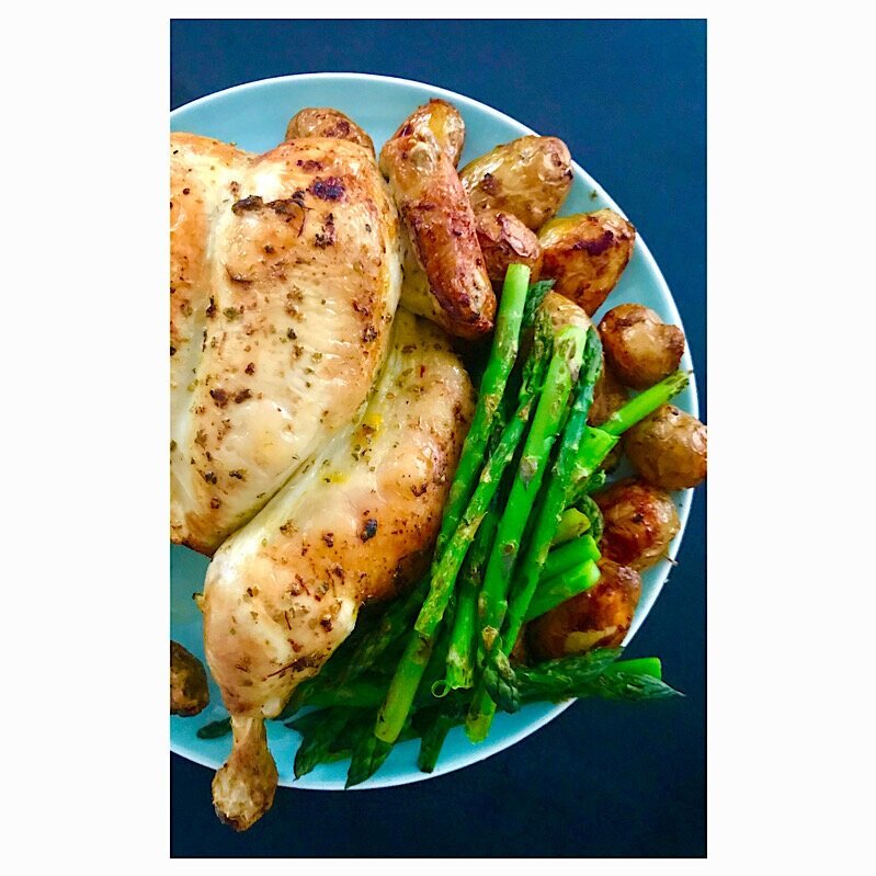 Roast spatchcocked chicken with saffron, herbs and chicken-juice potatoes
